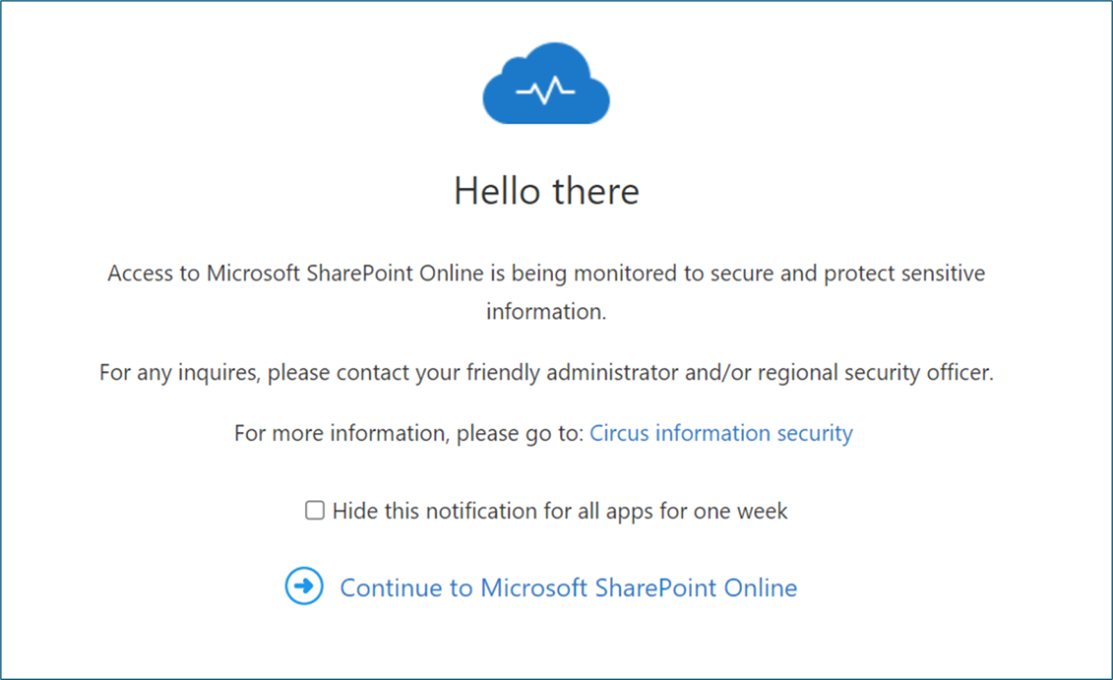 When these users access the SharePoint Online site, they will be greeted with an information screen. Btw: you can configure MDfCA to either display this or not. And you can modify the message, as seen below.