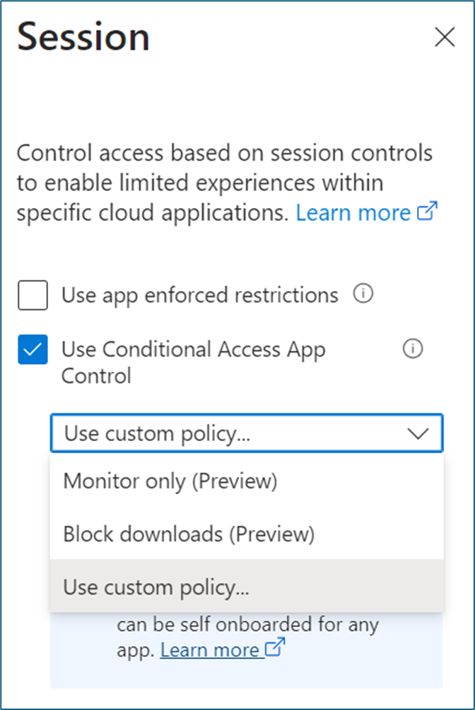 Let’s say we want to use only MDfCA and only for specific SharePoint Online sites. So we want to block downloads and prevent any copy/paste or printing. We will need to set-up two session based policies for this in MDfCA. And when we setup the Entra ID CA policy, both these policies will be applied.