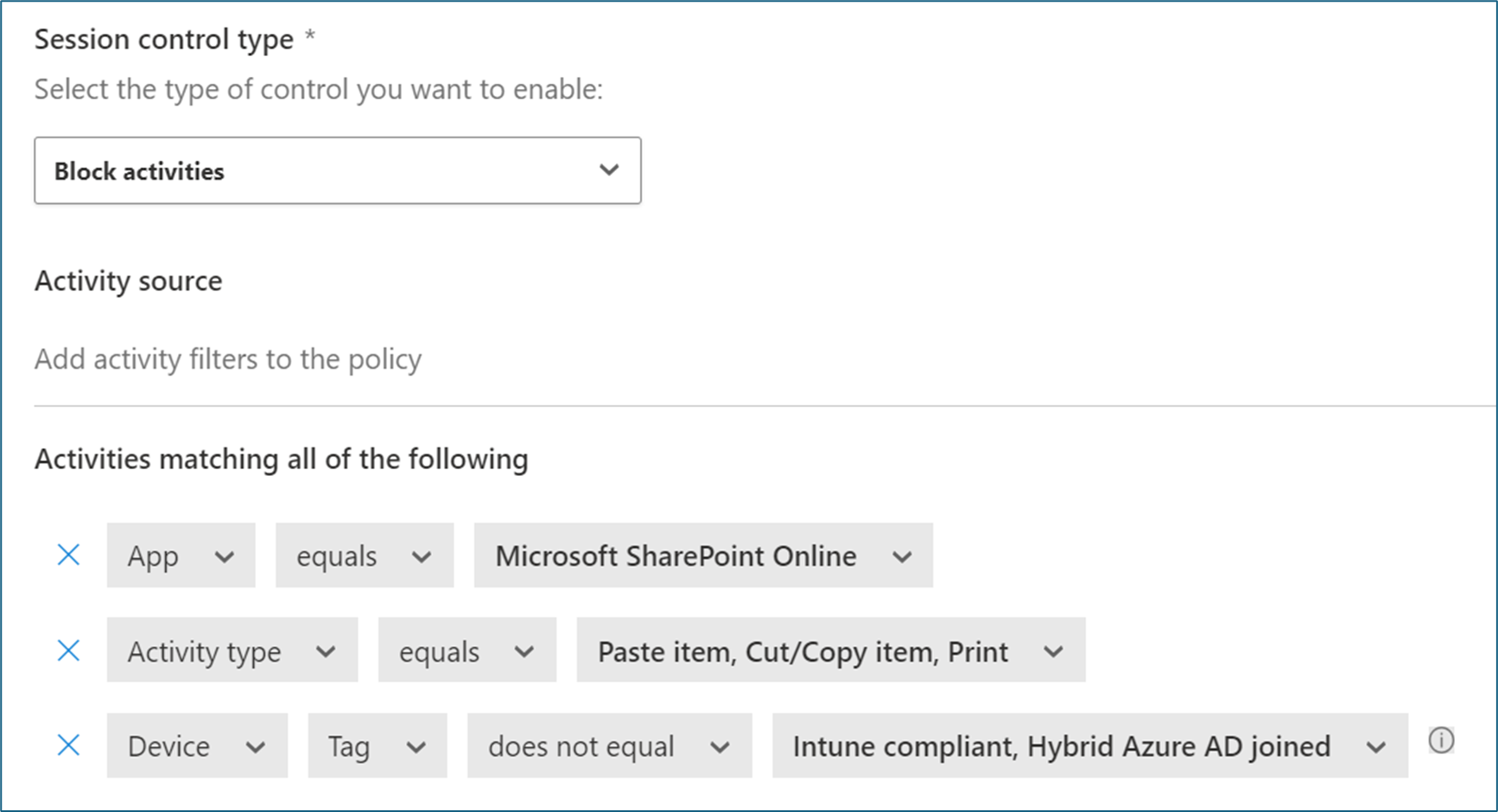Let’s focus on the policy to block printing first. This is a session policy in MDfCA. The most simple example is to block these activities when they occur in SharePoint Online and when the user comes from an unmanaged device.