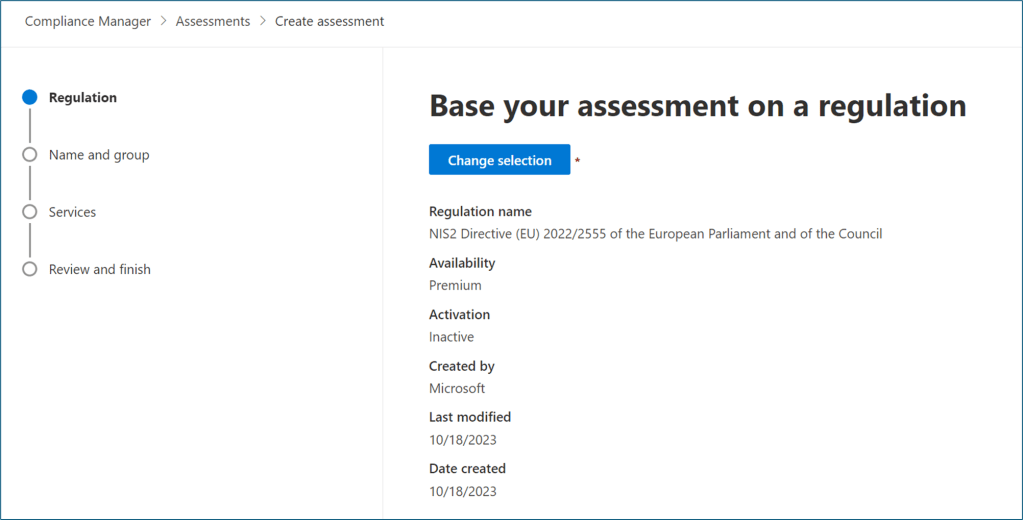 Creating an assessment is very straightforward. Go to the Compliance Manager | Assessments section. Here you will select the Add assessment option. The standard service this assessment will be activated for is Microsoft 365. Select the group (I would advise creating a new one for this) and finish the wizard.