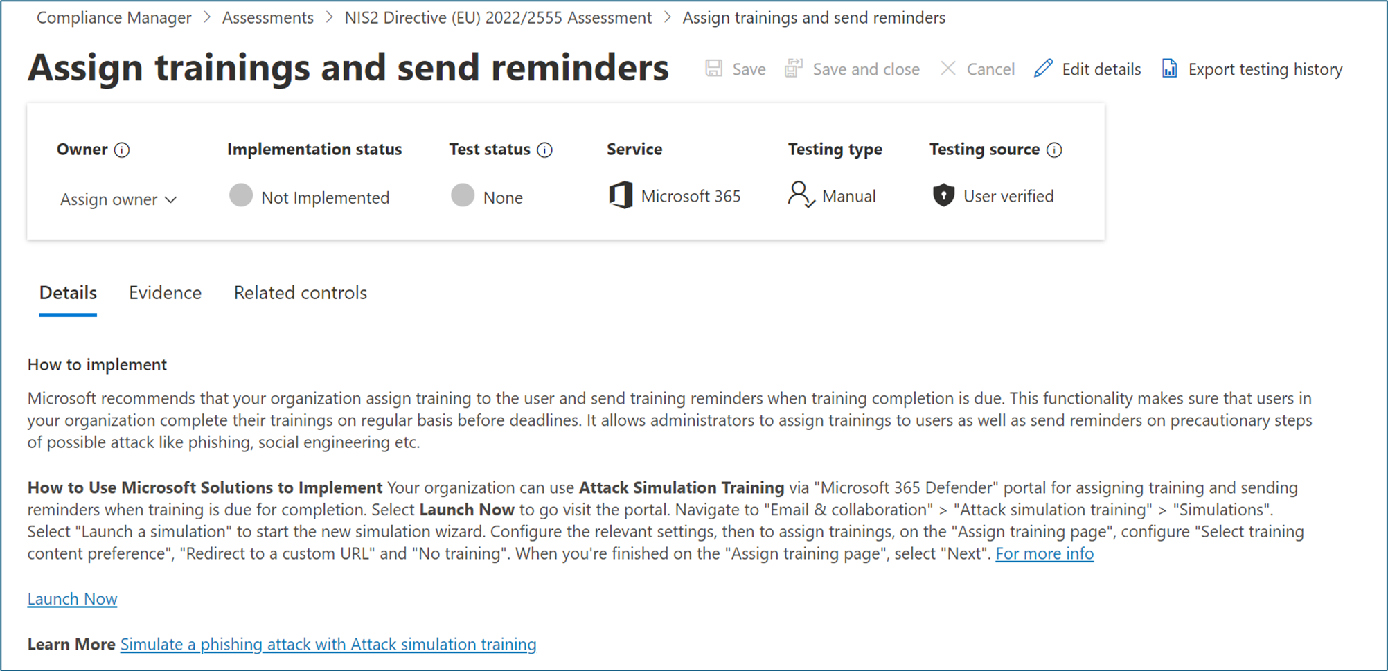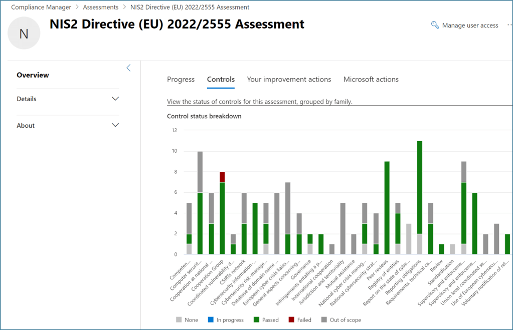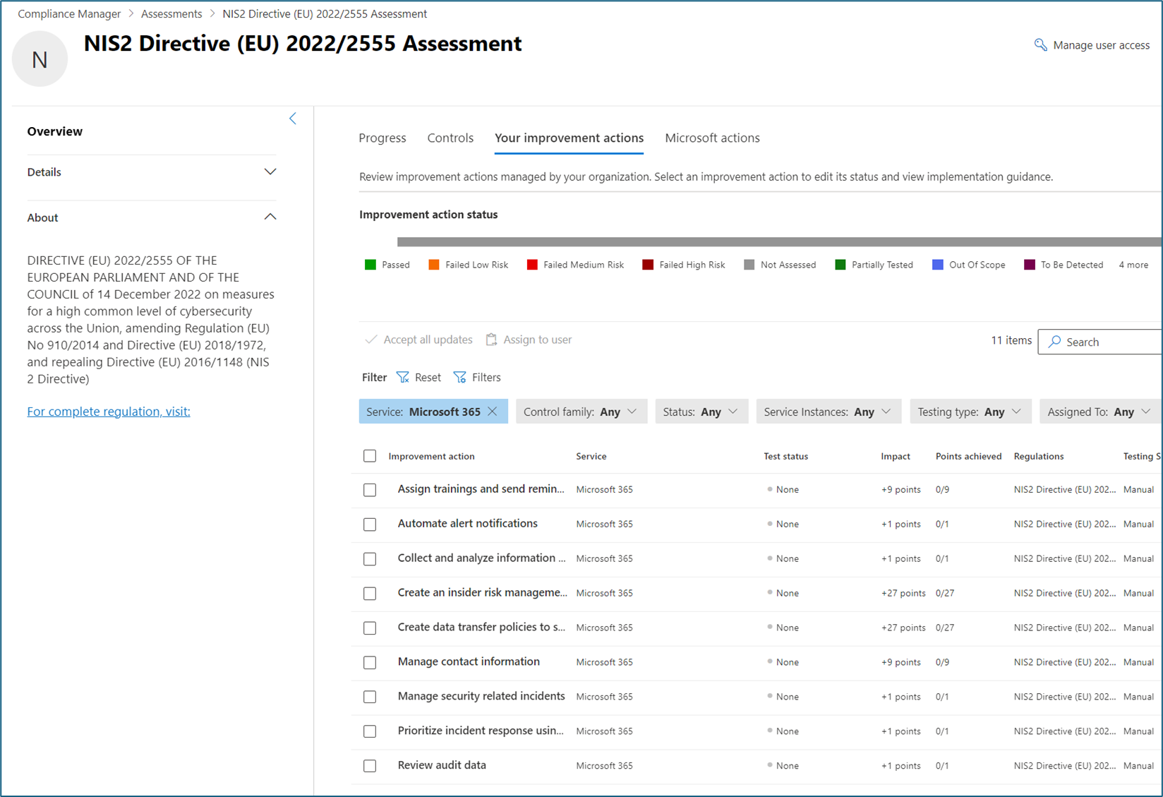The NIS2 assessment is somewhat limited (for Microsoft 365) and focuses a lot on Microsoft actions and non-technical controls. For a more complete overview, also add the ISO27001 (and GDPR if in the EU) assessments template to your assessment. This will give a complete overview and many of the technical controls will be automatically detected.