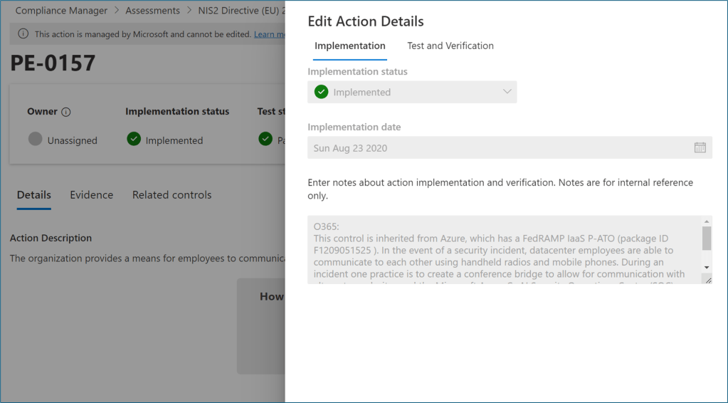 You can start with your improvement actions right away. In addition to your actions, you are also able to see the Microsoft actions, as part of the Shared Responsibility model. For example, this control mentions: