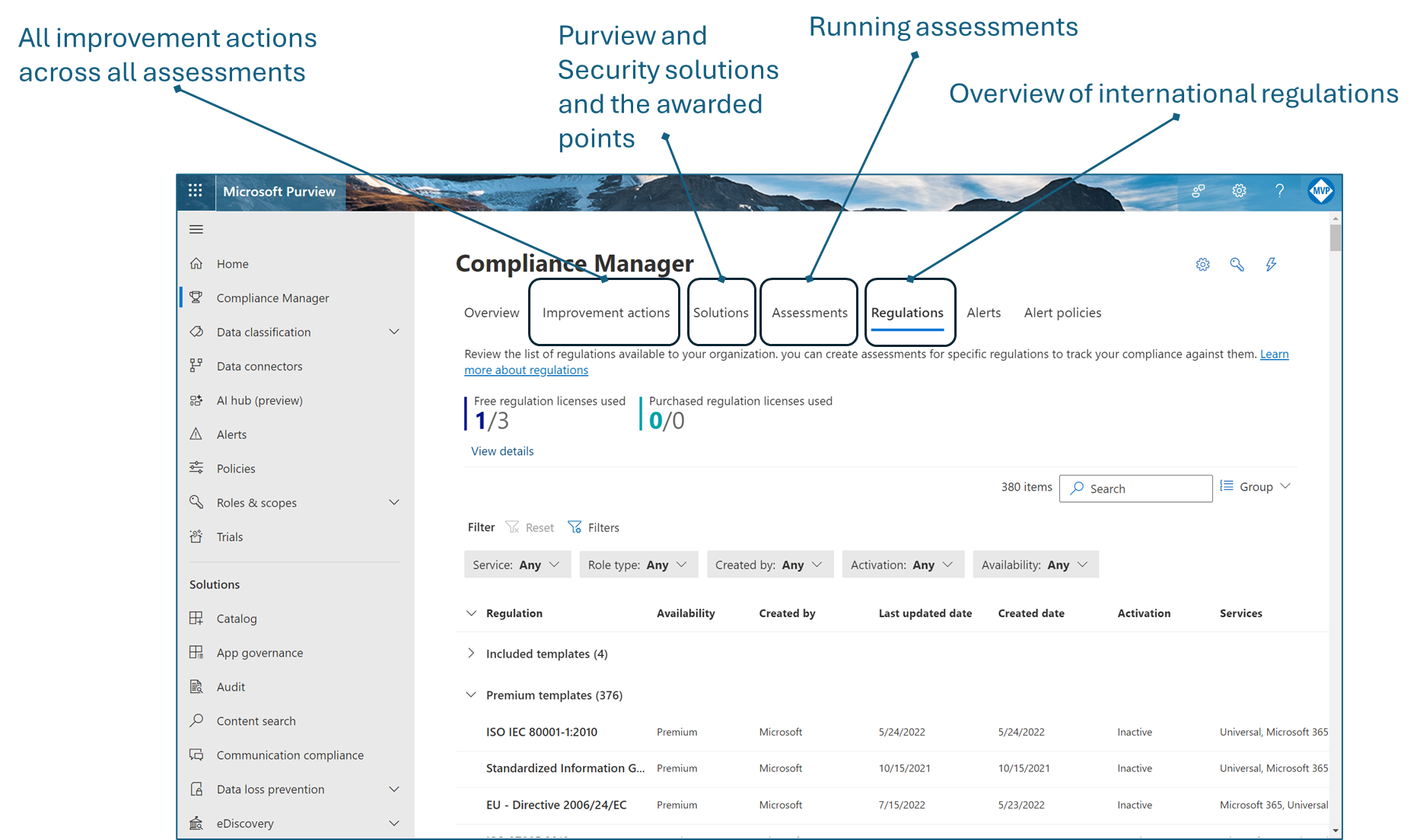 Secondly, you can use it to get an insight into many international and national regulations. The Compliance Manager has an up-to-date overview of many (300+) regulations, including all controls and the measures Microsoft has taken to address these controls. Want an overview? Here it is: https://learn.microsoft.com/en-us/purview/compliance-manager-templates-list
