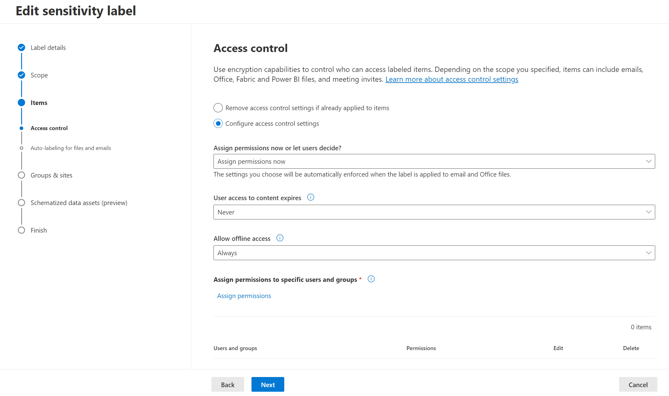 Getting back to sensitivity labels and going a bit deeper and into the settings for a sensitivity label, you will notice that the Encryption option in now (rightly) called Access control. This makes sense. but beware that controlling the access still implies using encryption ๐