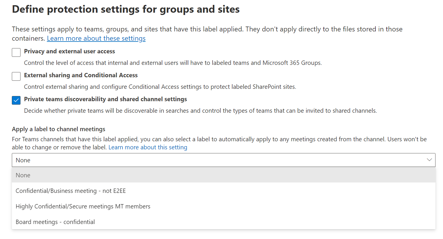 In the label policy for groups and sites, you will notice the new Private team discoverability and shared channel settings. And also the option to set a specific label to channel meetings, when the Team has been labeled using this sensitivity label. This last option is for Teams Premium only.