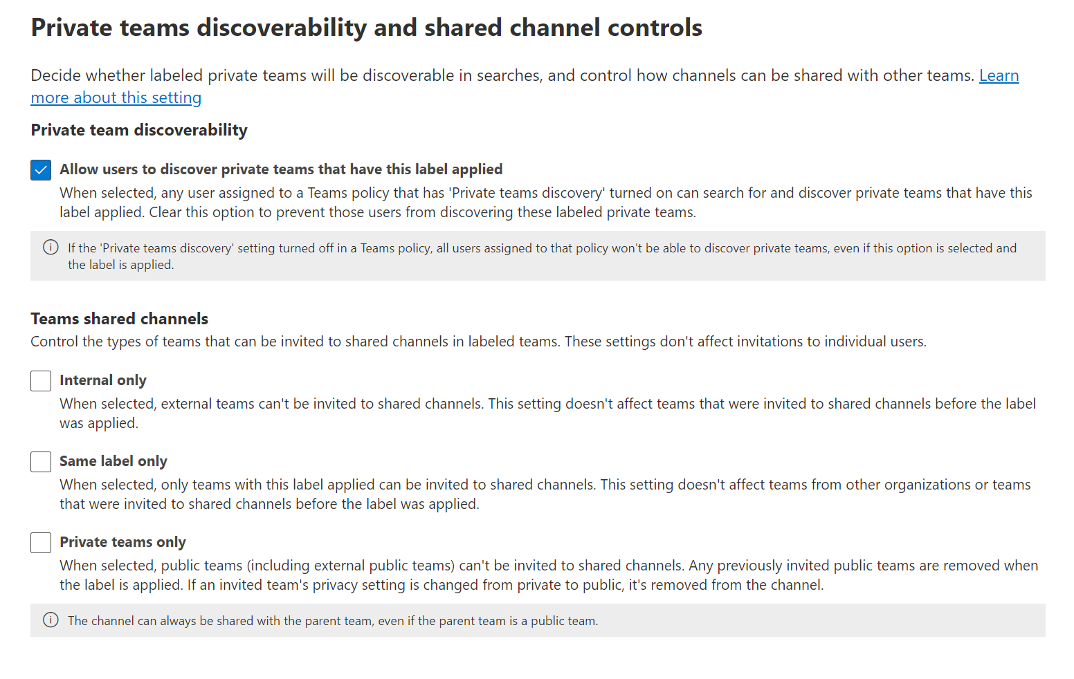The last option controls what type of Teams can be added to shared channels. Do not the subtle mention that these settings do not affect teams that were invited before the label was applied!
