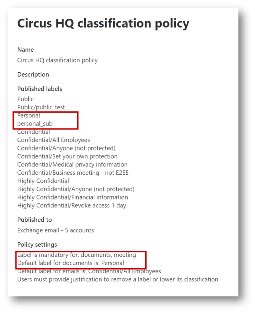 After the change has come into effect, the default label is removed from the policy. Any new document will not get the default label. Instead, you will see the new sublabel(s).