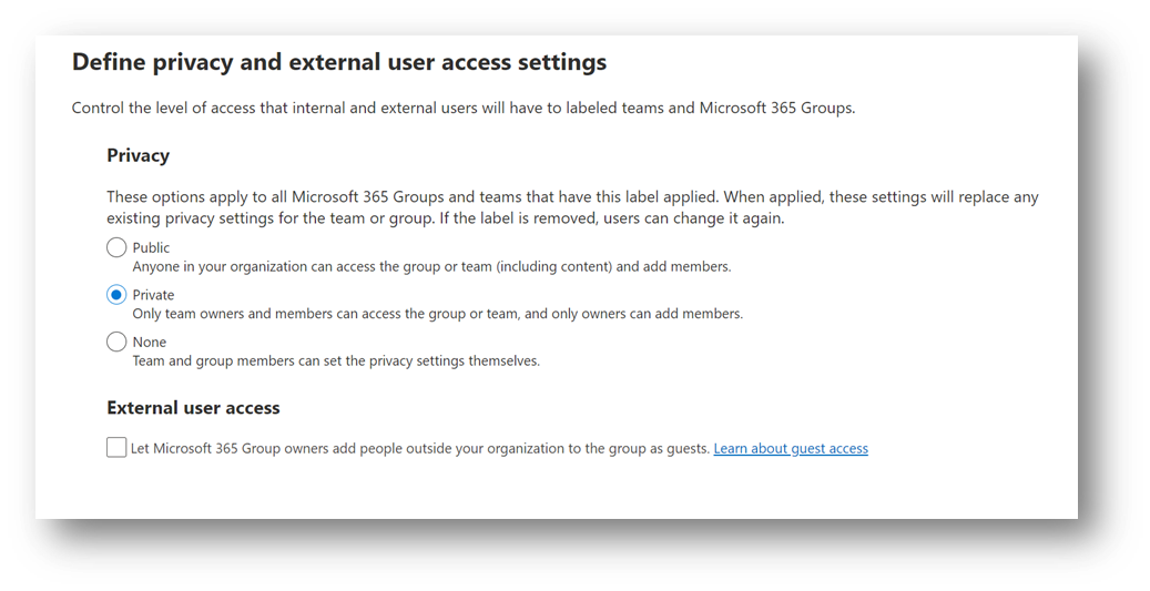 What they will do is set the access level for the container. These settings include the Privacy | External user access | Sharing links | Access from unmanaged devices options. And in this blog, I want to focus on the external user access.