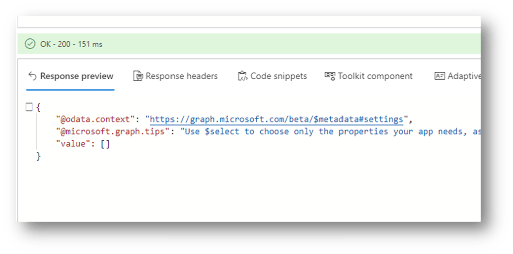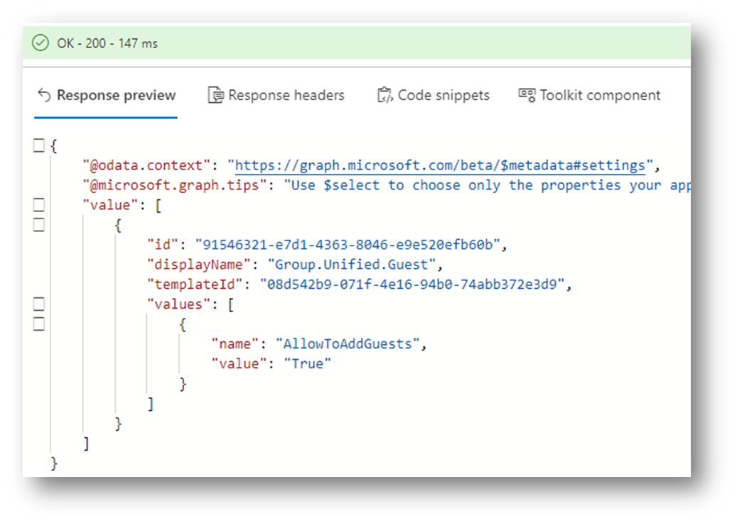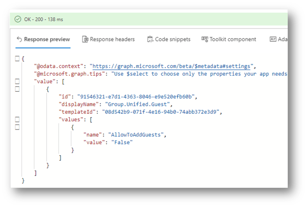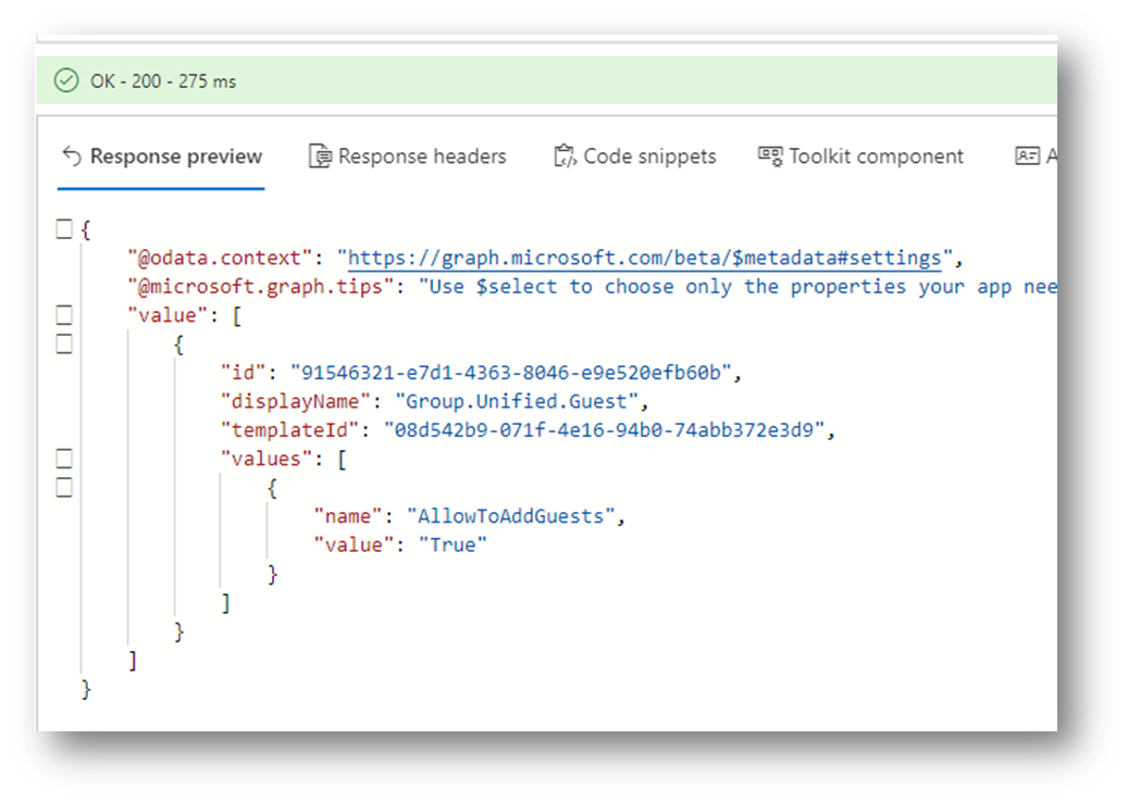 You can check if the settings for external users (guests) have been set by using the Microsoft Graph. You only need the ID for the Microsoft 365 Group. Using the Graph Explorer, you can use the (Beta) GET function below.