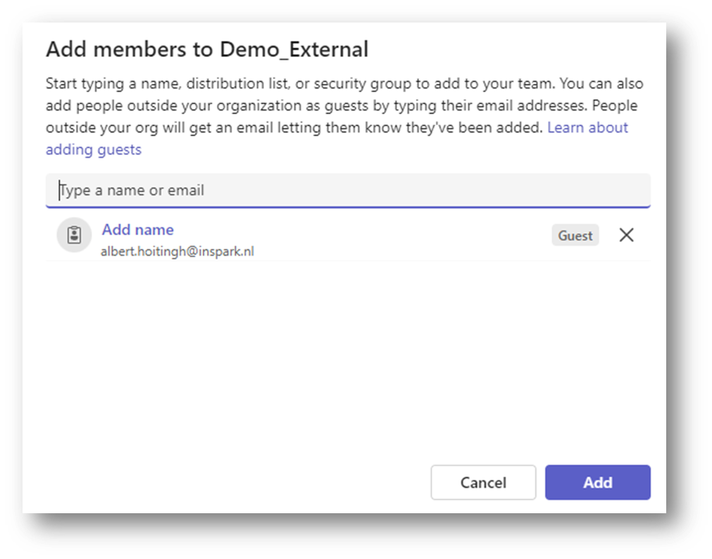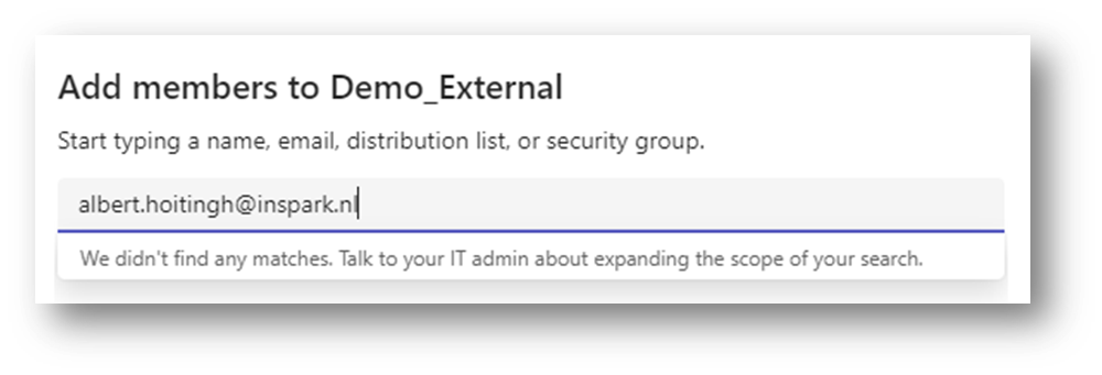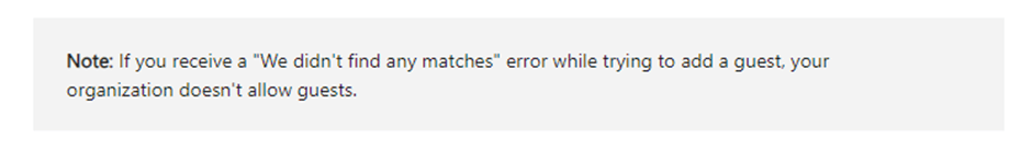 If you have a label that does not allow External user access, people will not be able to add guest users and will see an error message instead. Note that this message does not indicate that there is a problem with the settings. You’ll be notified that a specific match cannot be found.