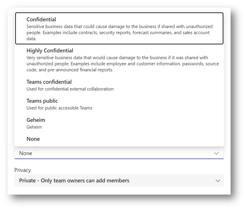 So what to do? Well, basically, when you need to be able to add external users to the team (or change this visibility): create a sensitivity label for this and downgrade the more restrictive label. Removing the label does not work.