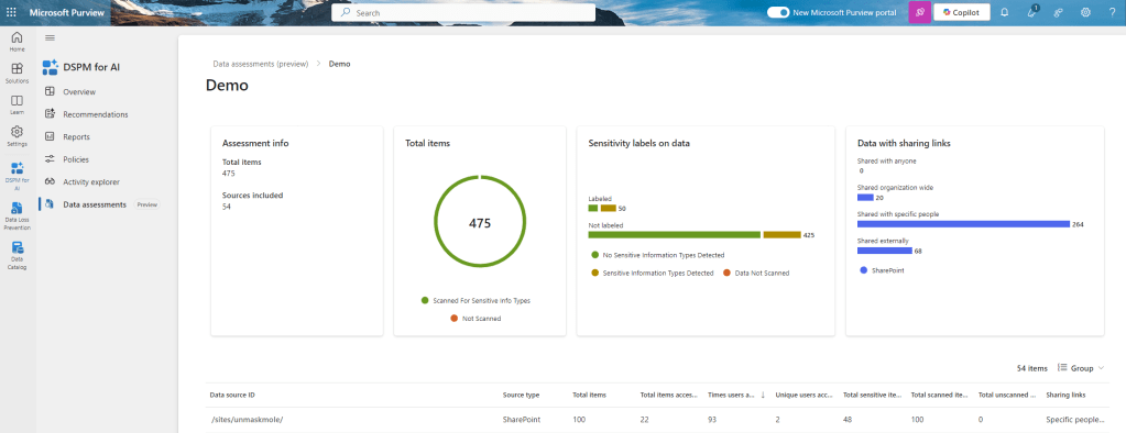 DSPM for AI does more than provide insights (more on this in the Start protecting section below). But a new (preview) function is called Data assessments. And these assessments provide you with an overview of sensitivity labels and sharing links within the organization. Like I mentioned earlier, these dashboards do have a lot in common with SharePoint Advanced Management.