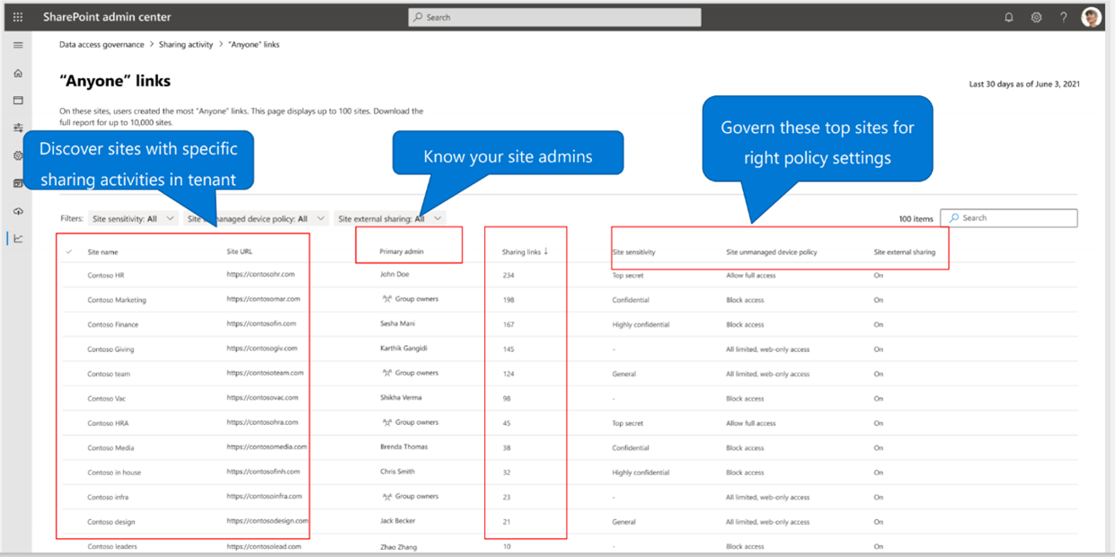 Let’s start with this component – which (by the way) is now licensed with Microsoft 365 Copilot. Microsoft is working on and/or already release more data access governance reports. Two examples of these are an overview of sites including all the type of access links. And an overview of sites that contain the “share with anyone within the organization” links.