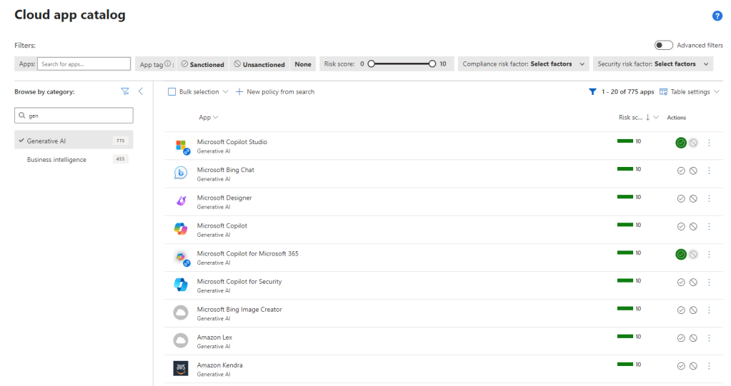 Another level of insights in provided by Microsoft Defender for Cloud Apps. In the cloud app catalog (and also the cloud discovery) you get an overview of (the use of) generative AI apps and the ability to control the use of these apps and even block them.