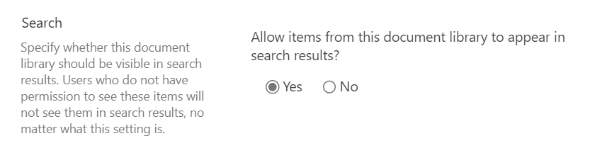 Other blocking actions can be set for SharePoint Online sites and libraries. The latter is a more “vintage” way to disallow content from being shown in search results. It can still be found in the advanced library settings.