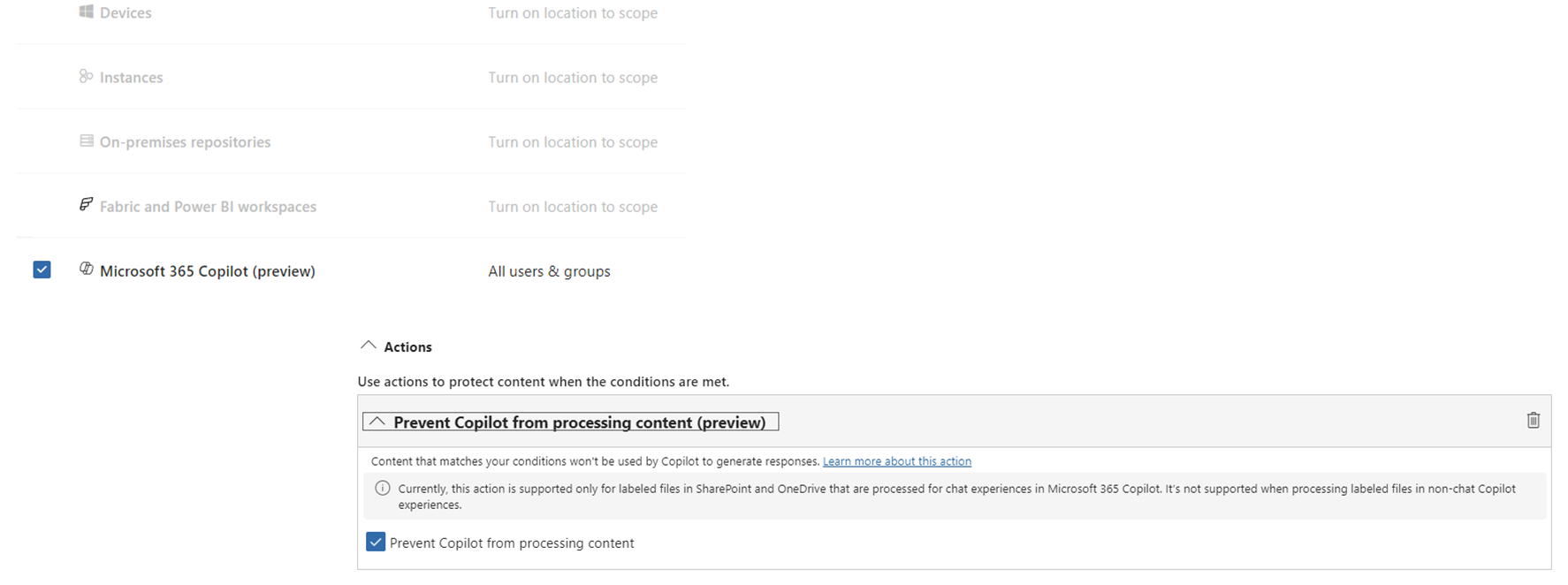 By using the advanced settings of a sensitivity label, you can excluded labeled documents from being used by Microsoft 365 Copilot. Note: this is not the same as the Copy and extract permission in the label. By removing that permission, you do not remove the document from the Copilot scope. You only remove the option to recreate documents based on the labeled content.
