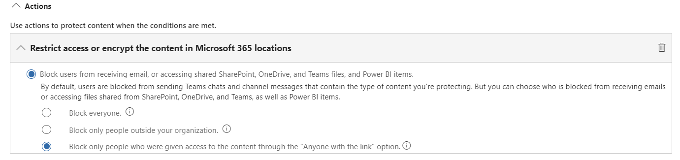 Another great way to protect your content is related to the problem of oversharing. Microsoft introduced a new DLP action some time ago. And this one is aimed at retroactively restricting access to content that has been “Shared with anyone”. As the “Anyone” link is basically a way to share information anonymously from your tenant, then this is a must-have DLP action for specific sensitivity. If you have this option enabled that is. Even regardless of Microsoft 365 Copilot.