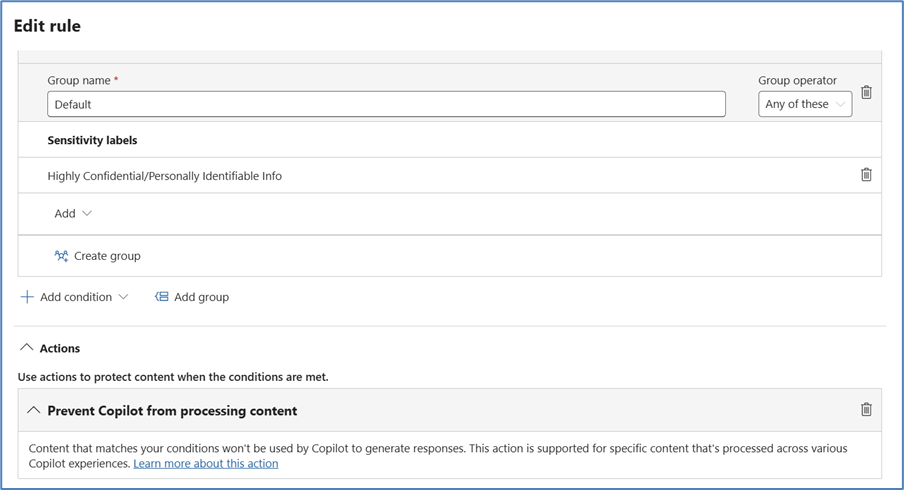 If the label access control is more lenient – but we still don’t want those labeled documents being used in summarizations by Microsoft 365 Copilot, we create a specific Data Loss Prevention policy and rule for this. More on that later.