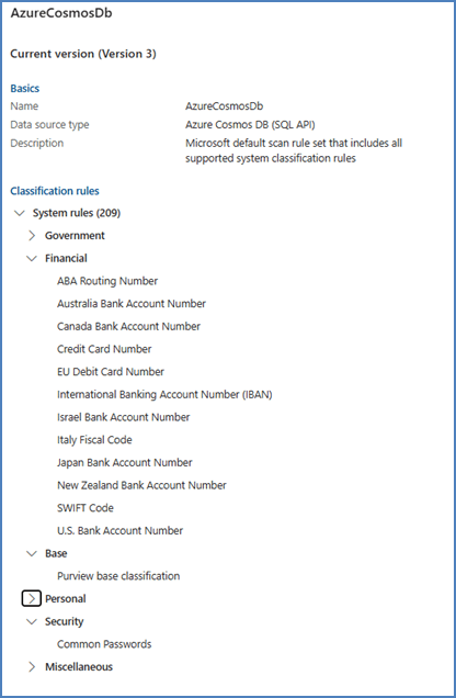 Note: Microsoft Purview uses a concept of Scan rule sets in the Data Map function. These sets have a defined list of sensitive data that will be used. For example: the default set for Azure Cosmos DB. If you have the need to customize this, you can by creating your own data set.