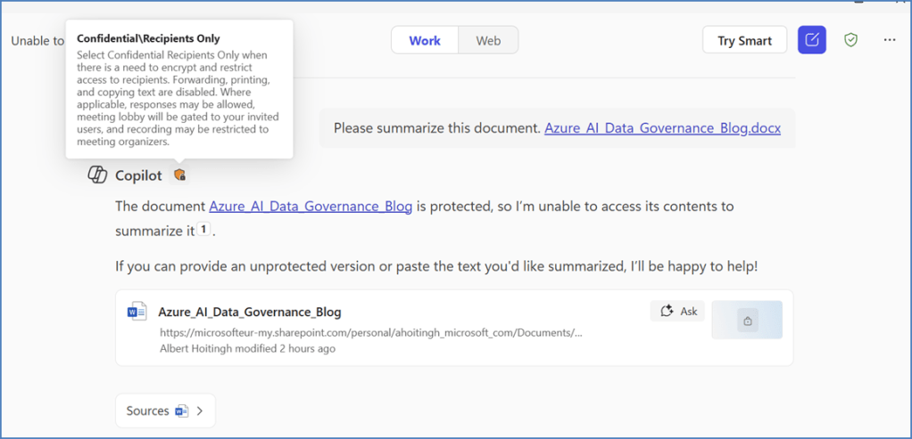 As a small side-step; We know that Microsoft 365 Copilot respects the access control settings of the sensitivity label. In the example below, I am not part of the selected label. And Copilot (or any other Generative AI platform) cannot help me with my summarization.