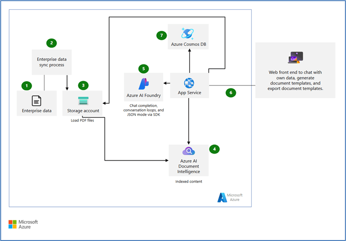 The figure below shows an example architecture for generating documents using Azure Storage and Azure Cosmos DB using a web front-end to chat. This front-end can also be Microsoft Copilot of course 😊