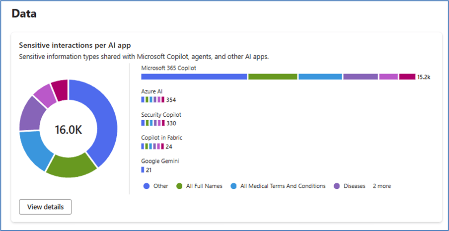 Amongst many things, Microsoft Purview is known for the ability to detect specific sensitive information in data. An example of this is the Data Security Posture Management for AI (DSPM for AI) module. This module lists sensitive interactions with AI, even on an agent level.