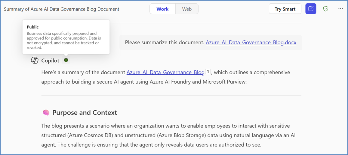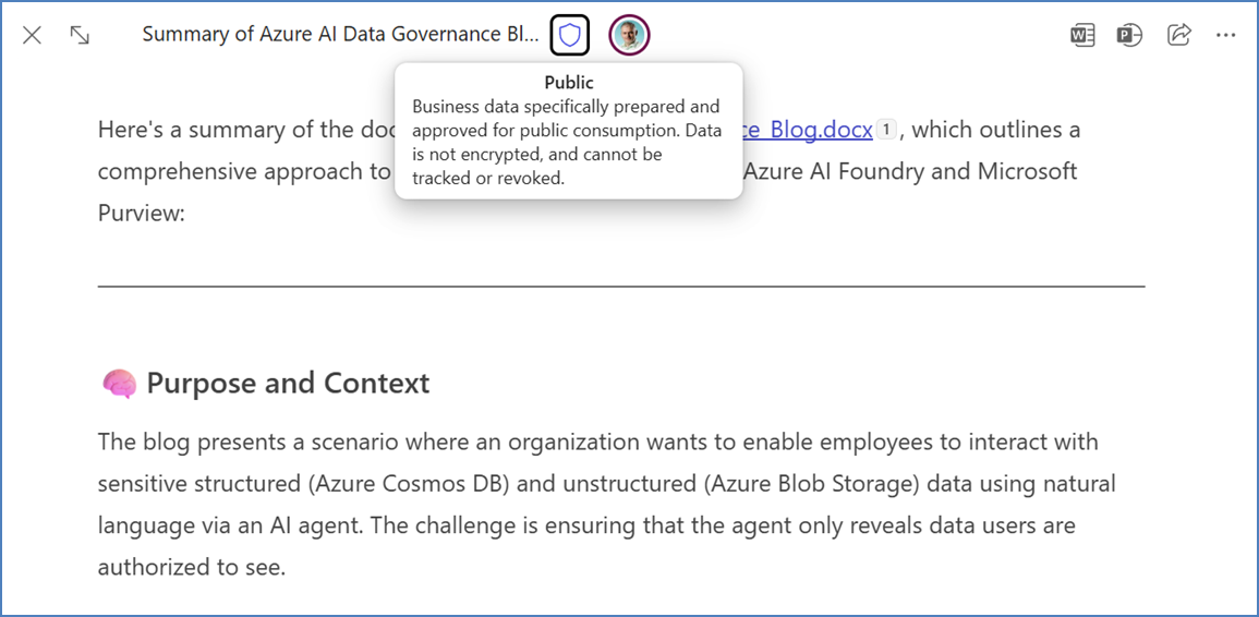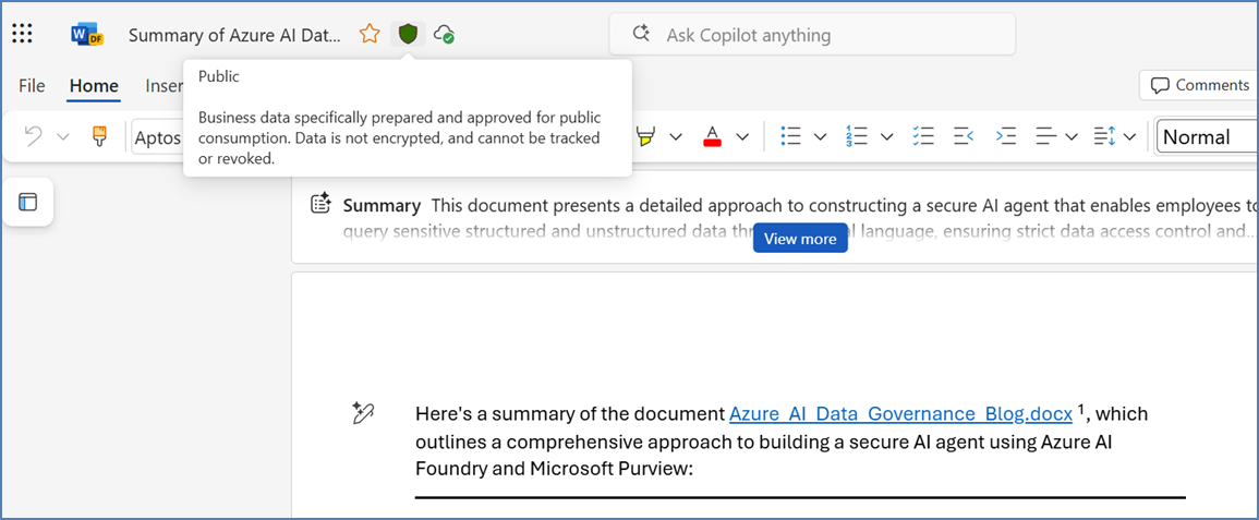 Take this blog article. I’ve created the outline in Microsoft Word and applied the Label “Public” as it is public information. Now I’ll let Copilot summarize this.