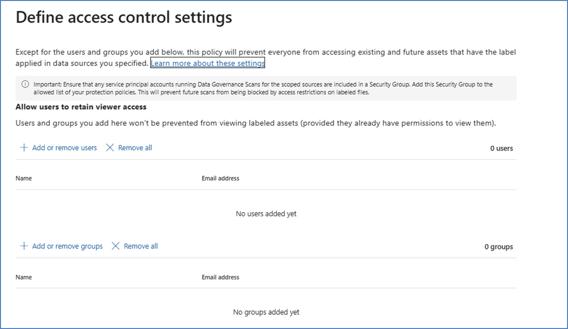 You create these protection policies in Microsoft Purview Information Protection. Beware that this is an excluding policy: if you are not in this policy (either with your identity or using the Entra ID Group you are part of), then you will not be able to access the labeled document.