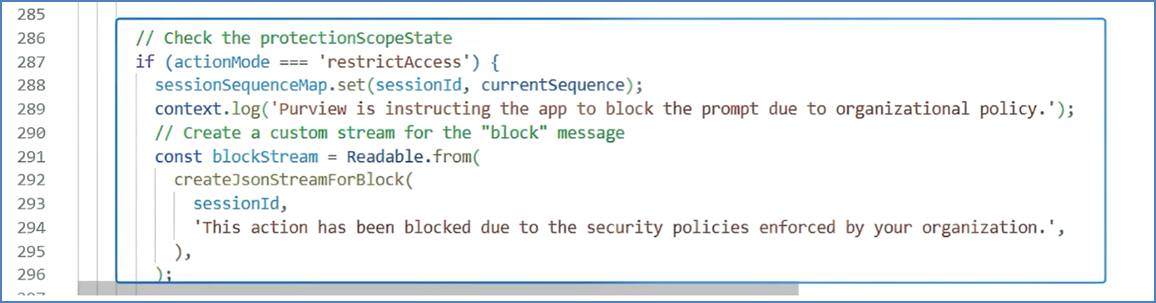 - Enforce policy actions immediately: If the answer is found to have disallowed data for that user, the agent can alter or block the response on the fly, rather than sending it and relying solely on DLP interception. This provides immediate feedback and control. The SDK is able to fetch sensitivity labels and DLP policy definitions.