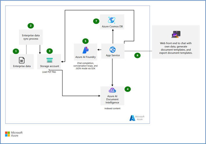The figure below shows an example architecture for generating documents using Azure Storage and Azure Cosmos DB using a web front-end to chat. This front-end can also be Microsoft Copilot of course 😊
