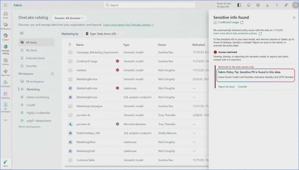 On the structured data side, Fabric now fully supports Microsoft Purview data loss prevention policies. You can now detect sensitive information in supported Fabric item types (e.g., Lakehouse files, datasets, notebooks, pipelines) and triggering policy tips, alerts, email notifications, and access restrictions when violations occur.
