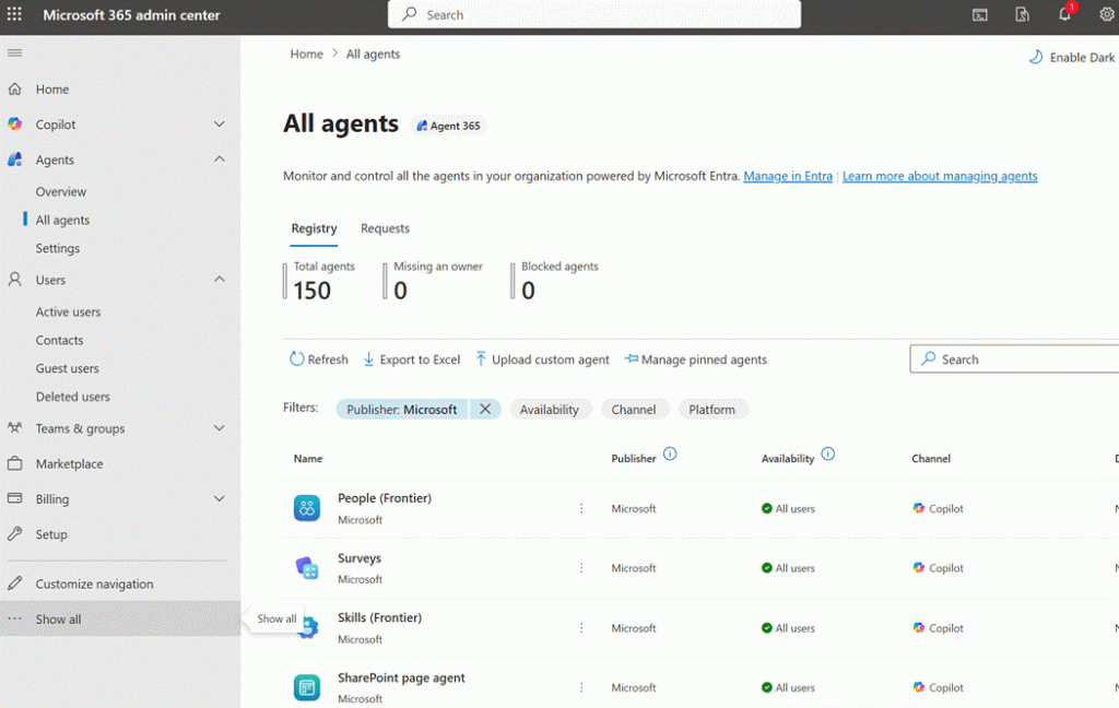 Agent 365 is accessible from the Microsoft 365 admin-center. This makes sense, as we are treating the agents as co-workers that have an Entra ID. By having this identity, we can discover active agents, review what data they touch, and apply access policies.
