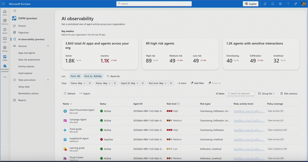 Whilst Microsoft Foundry (did you notice the name change from Azure AI Foundry btw?) has AI observability build-in, Microsoft Purview did not have a dedicated section for this. DSPM will now show you an overview of all AI agents (regardless where these are hosted) including specific risks and sensitive information.