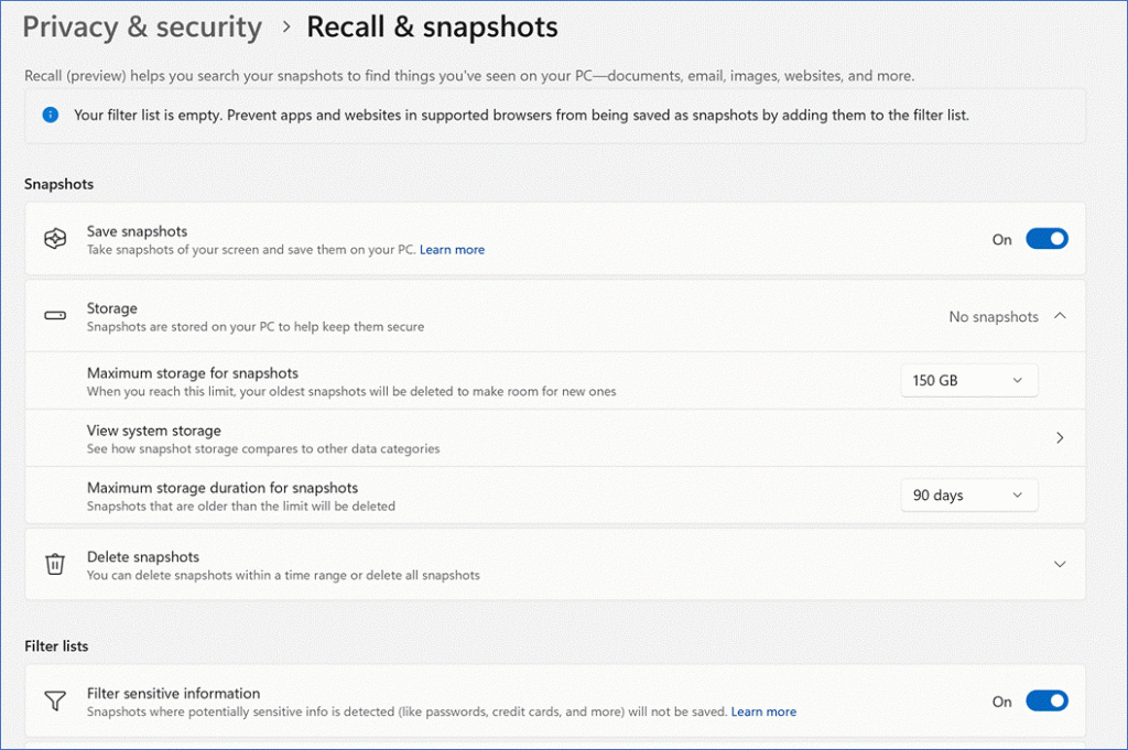 Microsoft Copilot+ PCs now have the ability to use Recall. This function creates snapshots (screenshots). These can be used to quicky retrace your steps and find your way back to where you were previously. When first announced there was (rightfully) feedback on data security and privacy. As these topics are paramount to Microsoft, the Recall functions has many guardrails build-in.